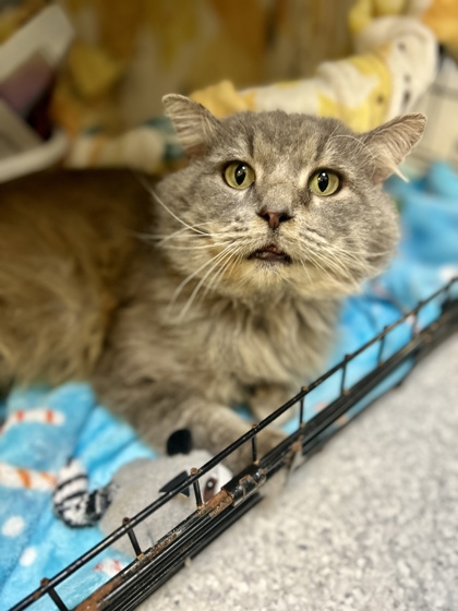 Oscar is a handsome medium-haired grey tabby boy who was found homeless in Southern Illinois and is now ready to find a safe, loving home. With striking stripes, soft fur, and a gentle personality, Oscar is affectionate, curious, and loves spending time exploring or snuggling in cozy spots.