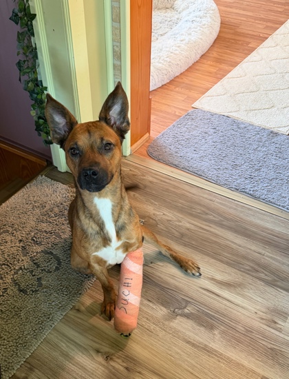 Mercedes is a sweet girl who came to us from a southern Illinois animal control and has been nothing but a gentle joy since arriving. She is currently recovering from a broken leg and has been incredibly brave throughout her healing journey. Despite all she's been through, Mercedes greets the world with a wagging tail, youthful eyes, and a beautiful temperament that shines through in every interaction. She's full of quiet resilience and affectionate charm, and she's ready to move forward into a loving home where she can continue to heal, be cherished, and share all the love she has to give.